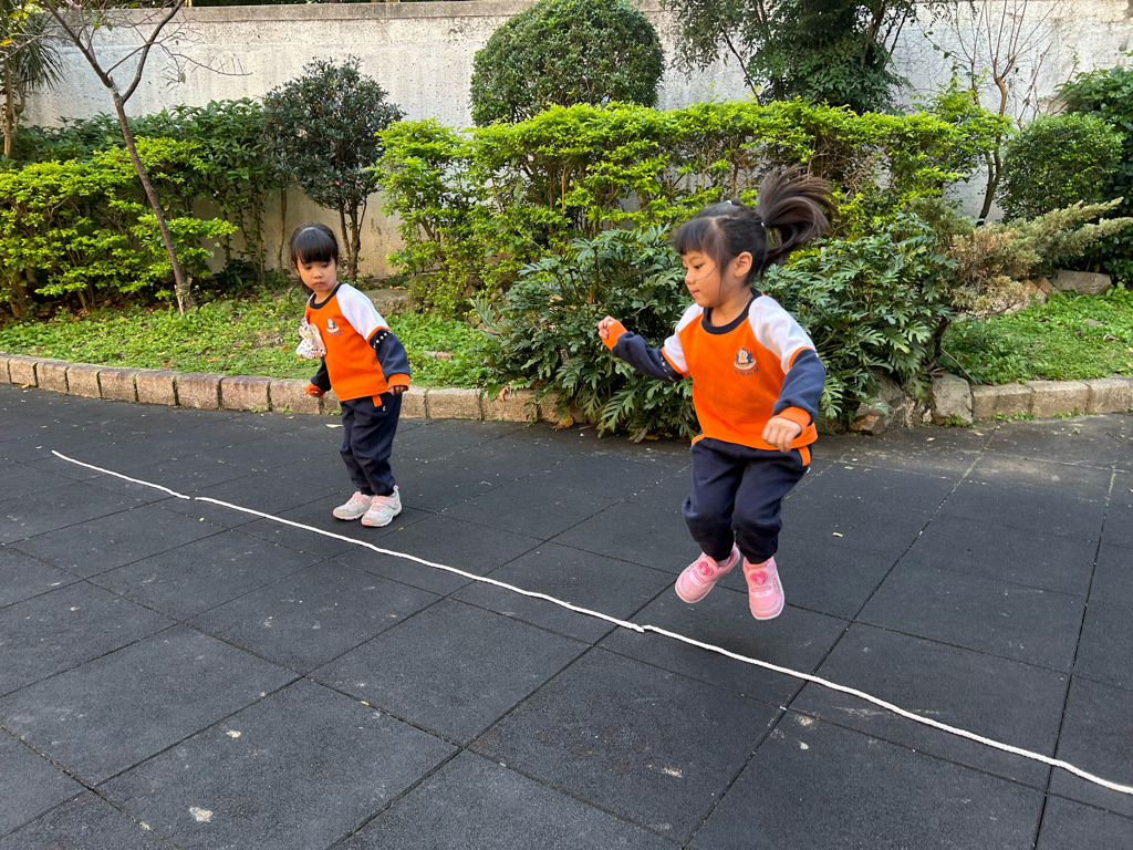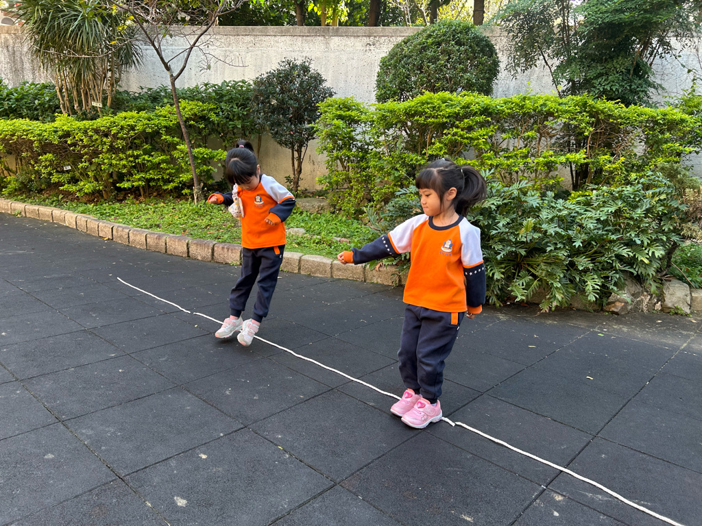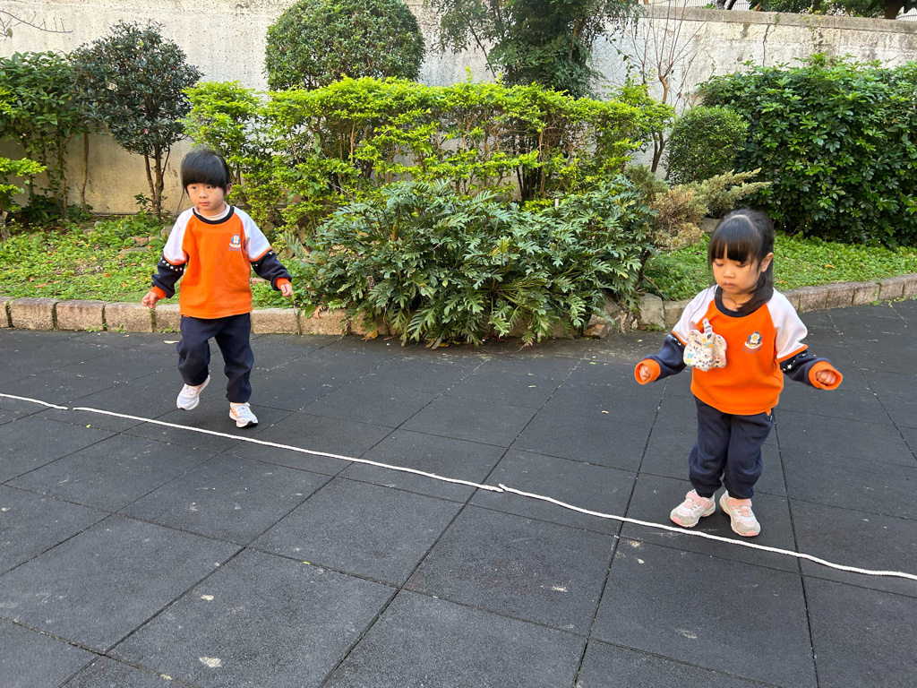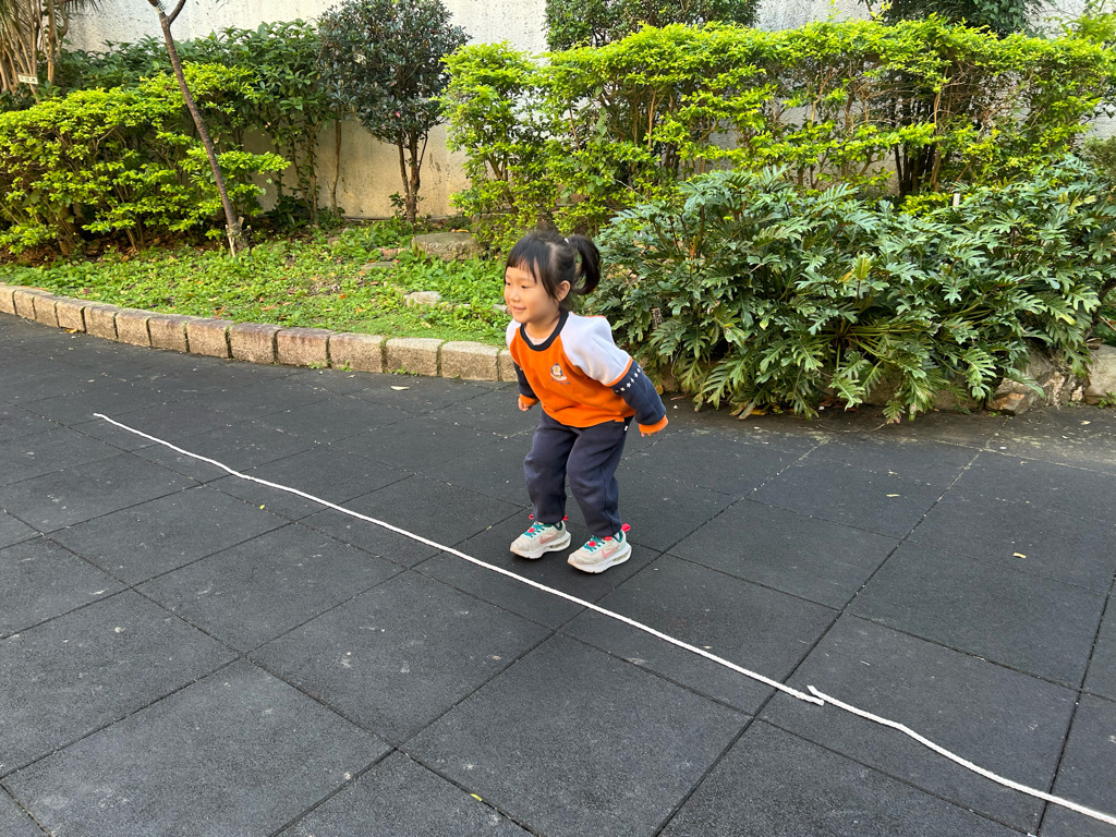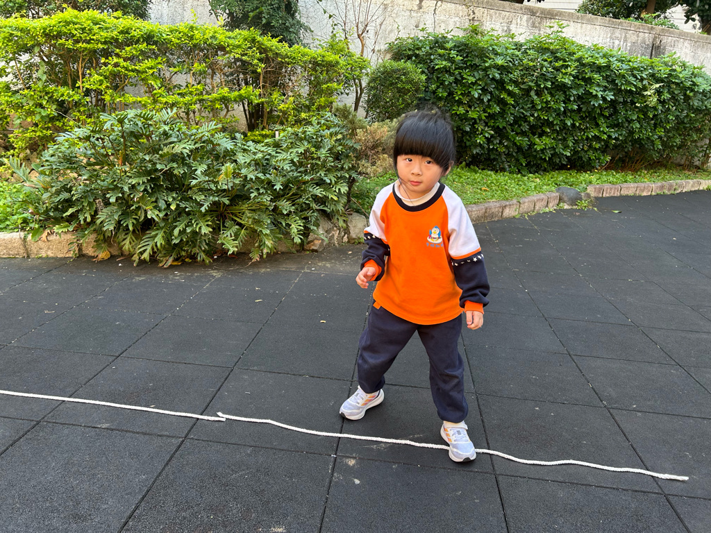 老師先向幼兒介紹繩子的用途,請幼兒觀察地上的繩子,並引導幼兒說出繩子的顏色與擺放方式。教師示範如何沿著繩子慢慢走,提醒幼兒張開雙手保持平衡,並鼓勵幼兒一個一個輪流嘗試。
