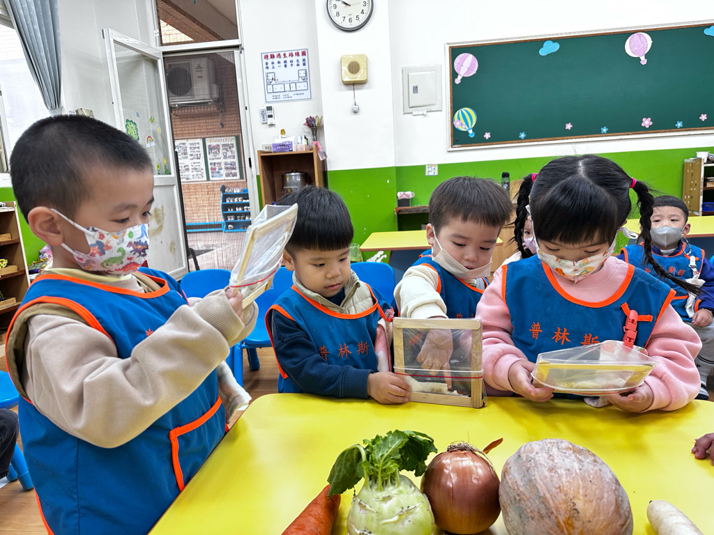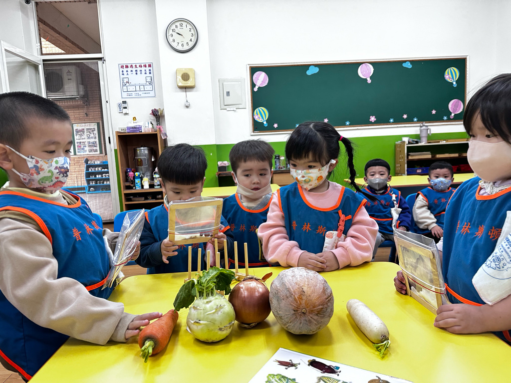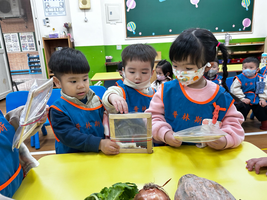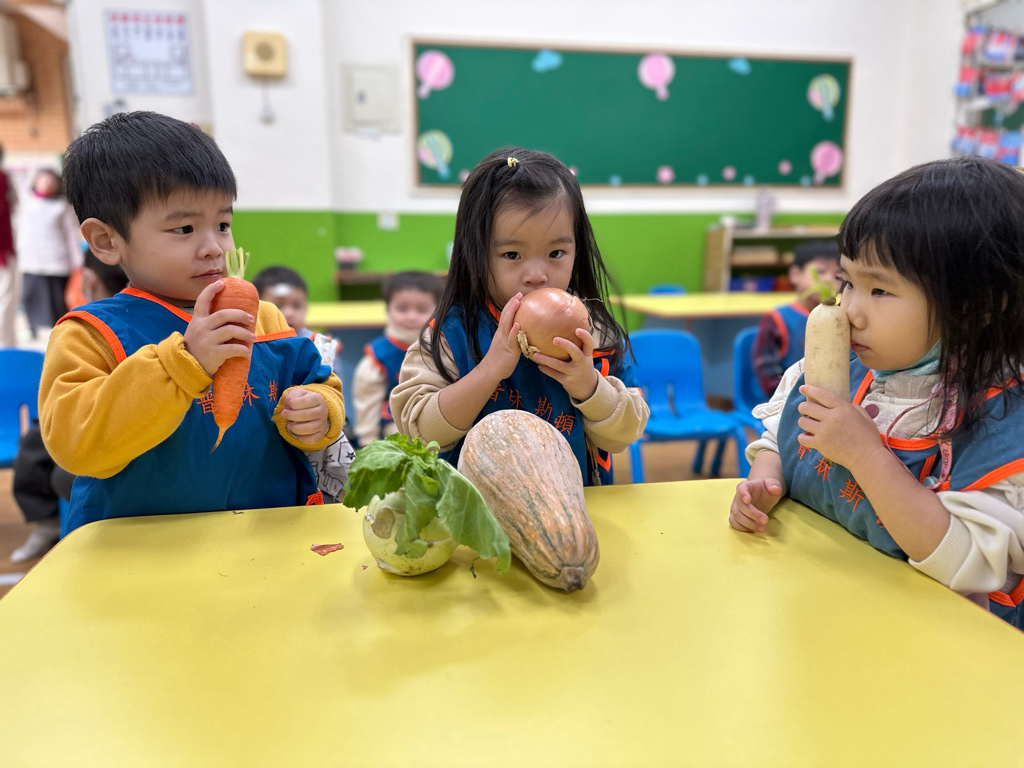 課程以繪本、蔬菜與遊戲操作激發幼兒動機,孩子在排序、觀察、種植與五感探索中展現好奇心與合作精神,透過觀察、比較與語言表達逐步建立認知概念。
