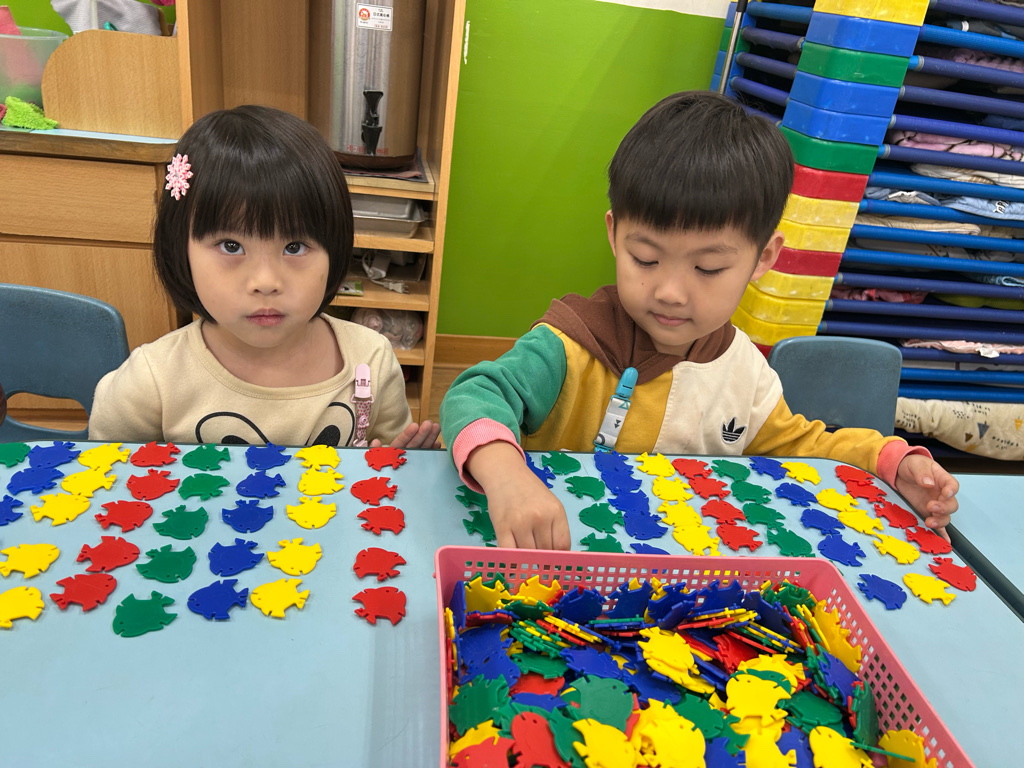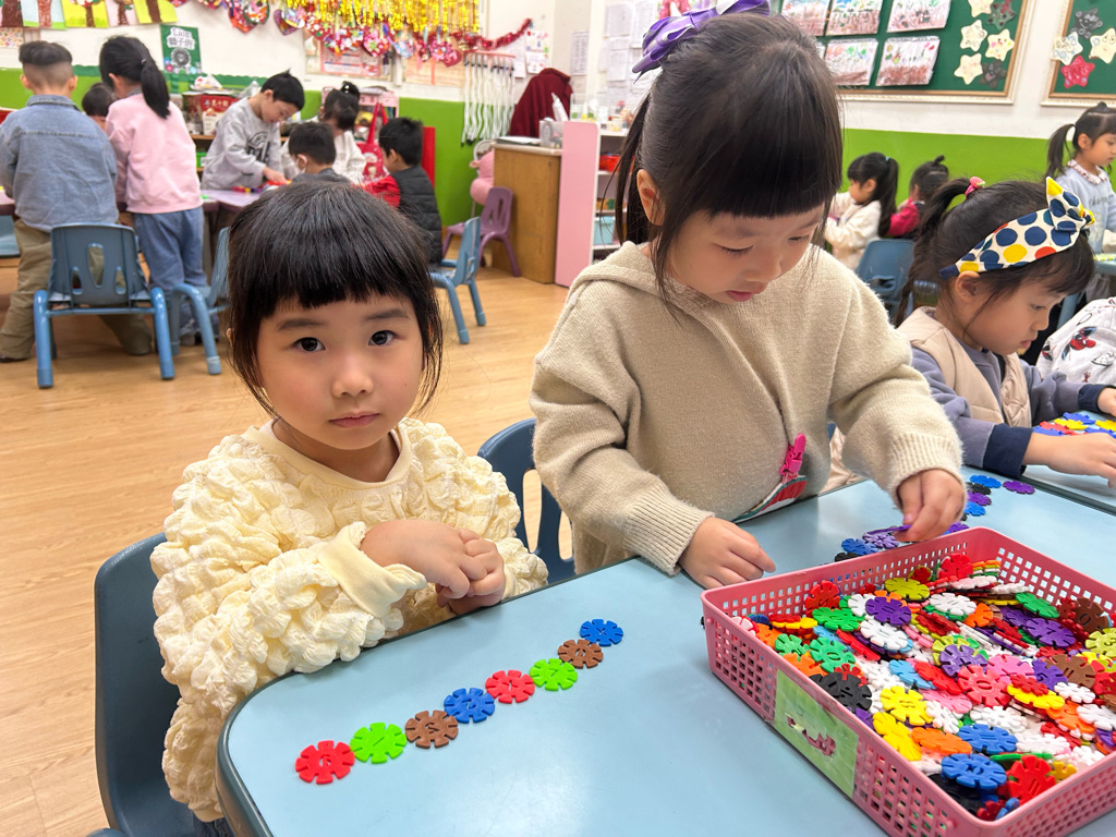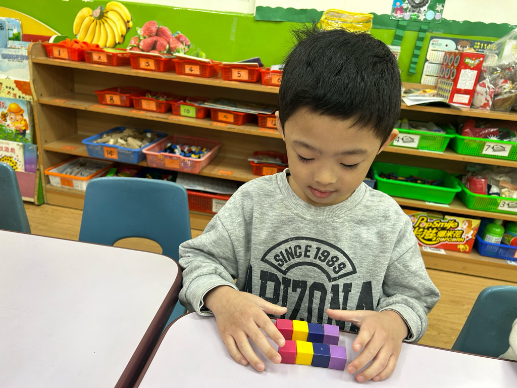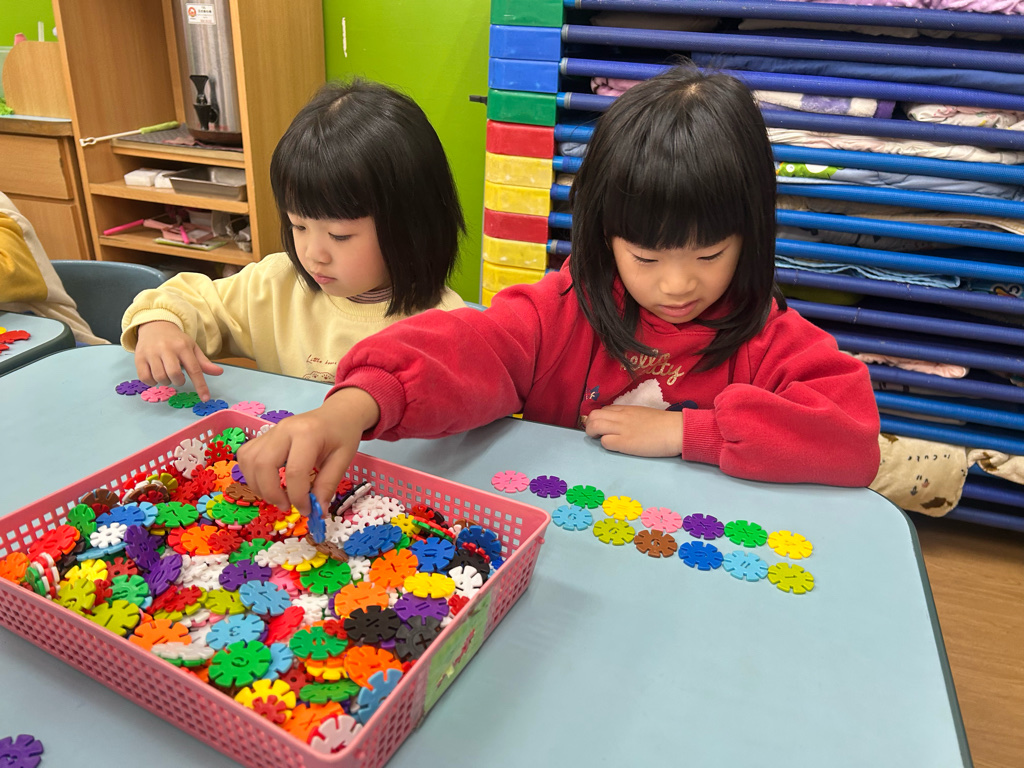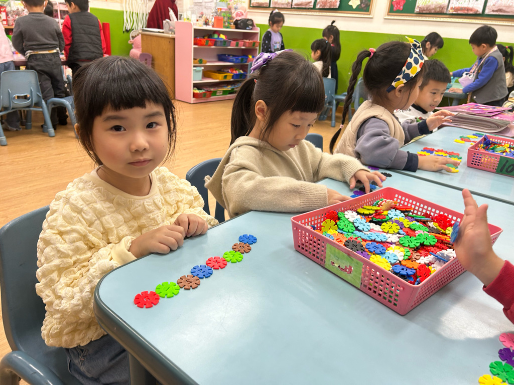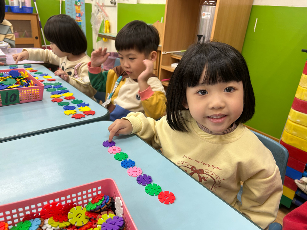 顏色序列練習活動中,老師先示範顏色排列的順序,並引導幼兒觀察顏色變化。操作過程中,幼兒專注地完成每一個步驟,並能一邊操作一邊說出顏色名稱,加深對顏色序列的理解。