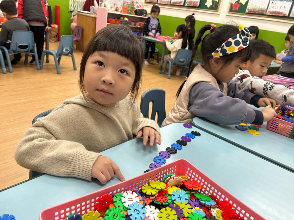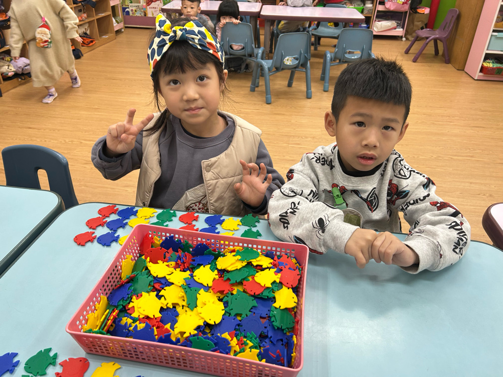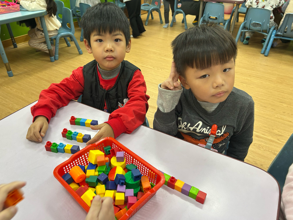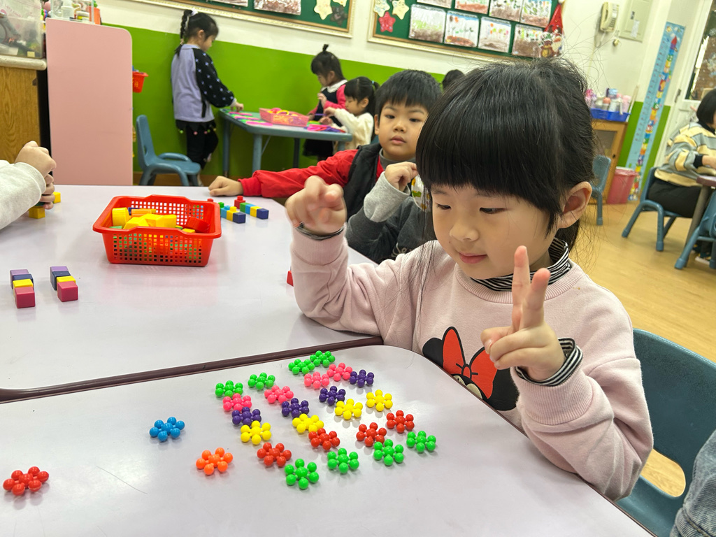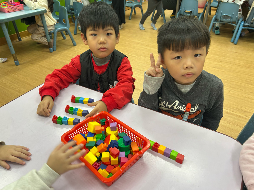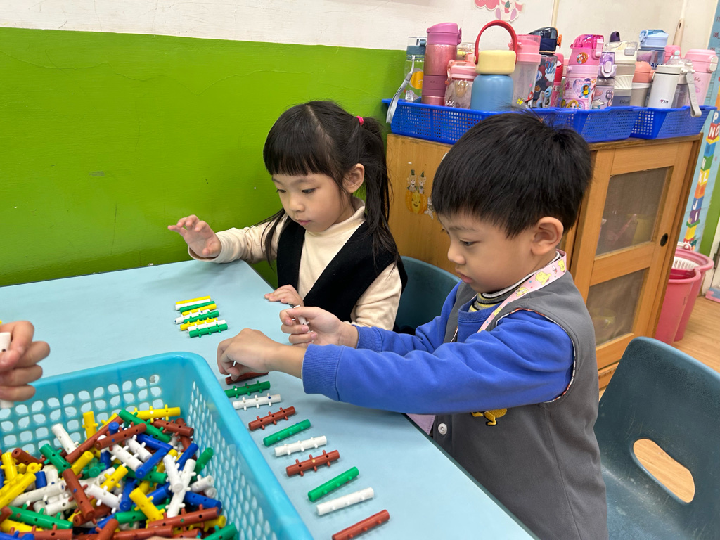 顏色序列練習活動中,老師先示範顏色排列的順序,並引導幼兒觀察顏色變化。操作過程中,幼兒專注地完成每一個步驟,並能一邊操作一邊說出顏色名稱,加深對顏色序列的理解。
