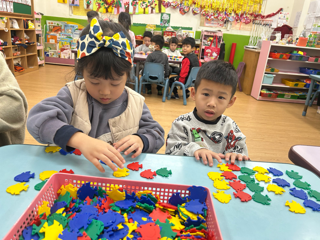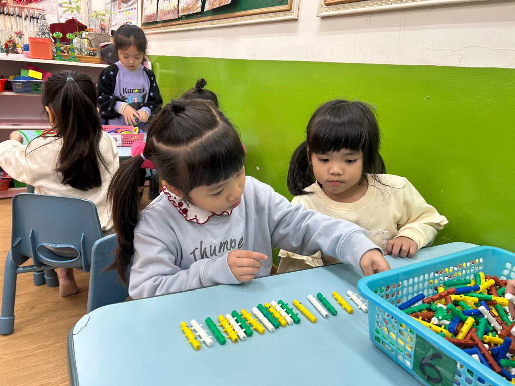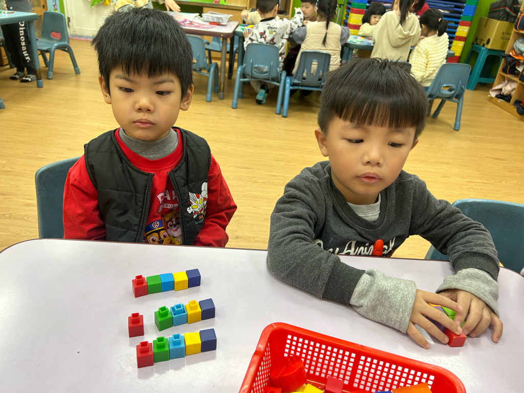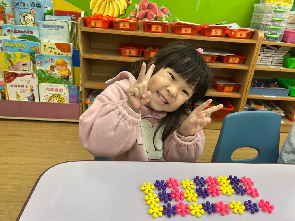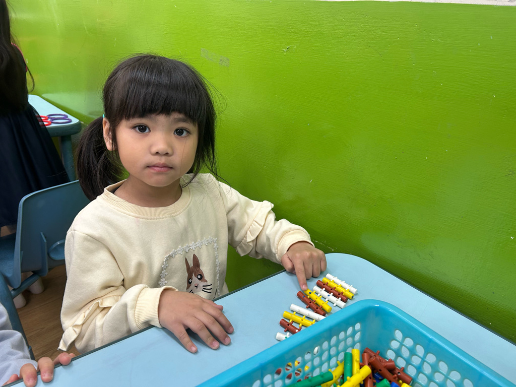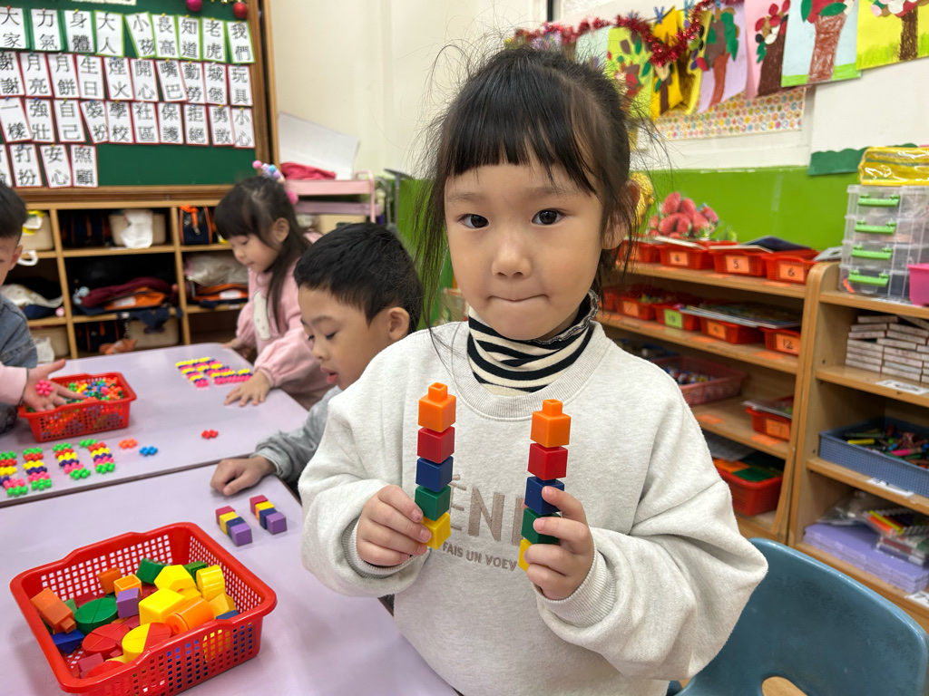 顏色序列練習活動中,老師先示範顏色排列的順序,並引導幼兒觀察顏色變化。操作過程中,幼兒專注地完成每一個步驟,並能一邊操作一邊說出顏色名稱,加深對顏色序列的理解。